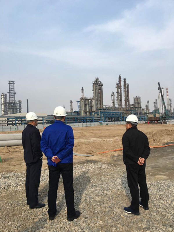 △圖為濱化集團(tuán)張忠正董事長(zhǎng)、濱陽(yáng)公司李嘉驪總經(jīng)理陪同我公司謝同寶董事長(zhǎng)參觀(guān)濱化集團(tuán)在建工程