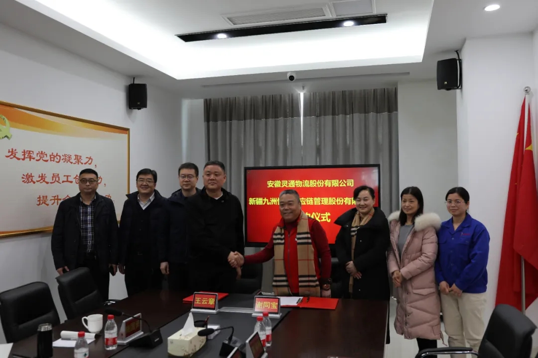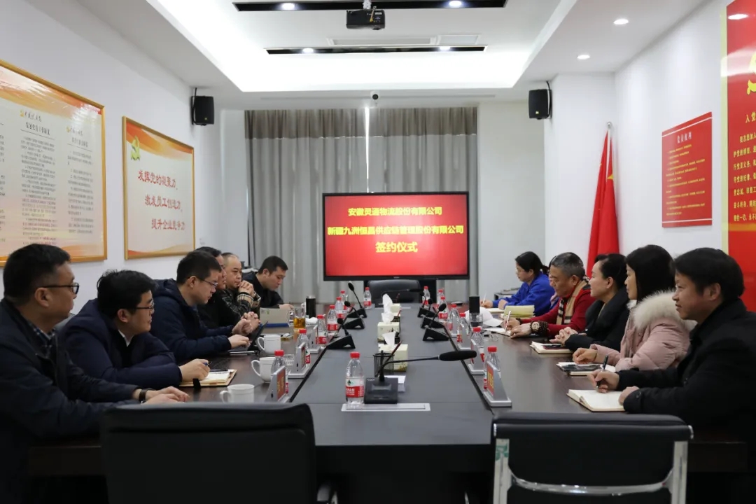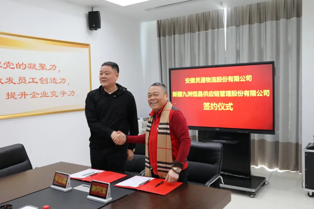 2021年1月18日,安徽靈通物流股份有限公司與新疆九洲恒昌供應(yīng)鏈管理股份有限公司(以下簡(jiǎn)稱“九洲恒昌”)在靈通集團(tuán)總部正式簽署戰(zhàn)略合作協(xié)議。靈通集團(tuán)董事長(zhǎng)謝同寶、總經(jīng)理吳德紅、財(cái)務(wù)總監(jiān)谷芳以及班子成員,九洲恒昌董事長(zhǎng)王云章、財(cái)務(wù)總監(jiān)柴宏亮等領(lǐng)導(dǎo)參加簽約儀式。