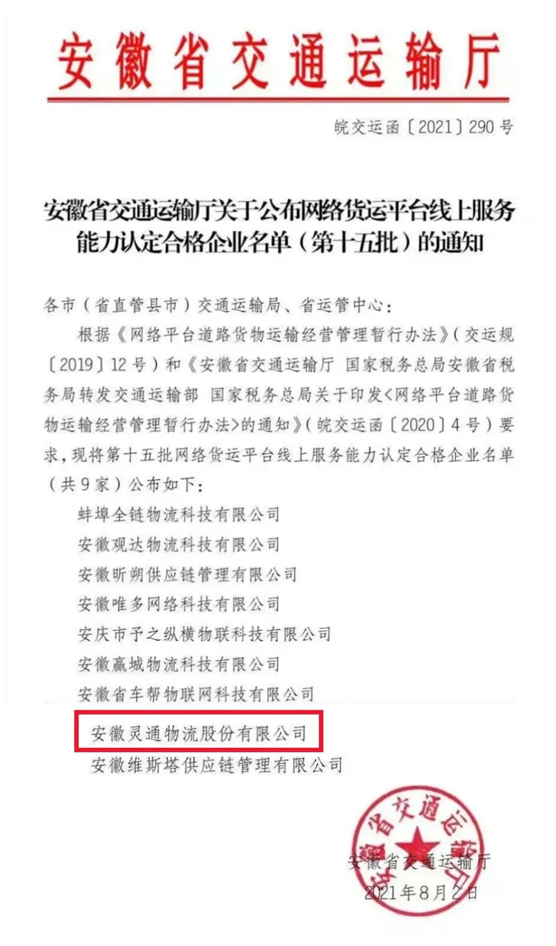 安徽靈通物流股份有限公司獲批安徽省網(wǎng)絡(luò)貨運(yùn)經(jīng)營資質(zhì),這是公司網(wǎng)絡(luò)貨運(yùn)業(yè)務(wù)由模擬到運(yùn)營到實(shí)戰(zhàn)上線的重要里程碑,標(biāo)志著靈通物流正式跨入網(wǎng)絡(luò)貨運(yùn)模式新時代。